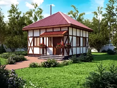 Проект "Бонсдорффия " - прекрасный одноэтажный дом для постоянного проживания каркасных с террасой.Площадь Рыскулова, 132 48.9 кв.м. с размерами 9 на 6.