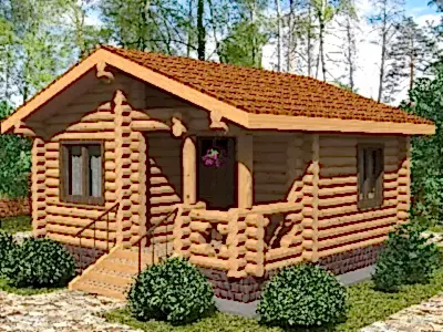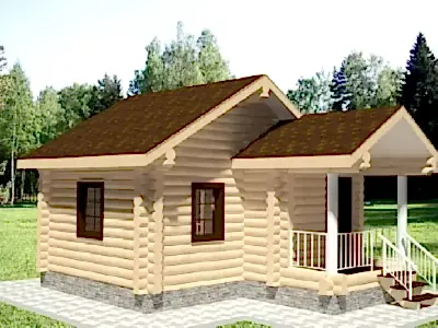Проект "Тейя " - красивый одноэтажный дом для постоянного проживания из оцилиндрованного бревна с террасой, с баней.Площадь Жандосова, 145 29.4 кв.м. с размерами 6x5.